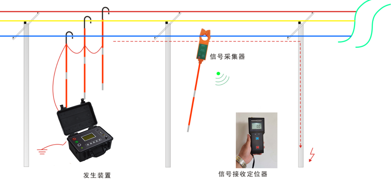 當線路出現(xiàn)接地故障時,在確定故障區(qū)段并且停運的情況下,利用信號源向故障線路注入特征電流,根據(jù)基爾霍夫定律,特征交流信號也一定通過故障點構成回路。